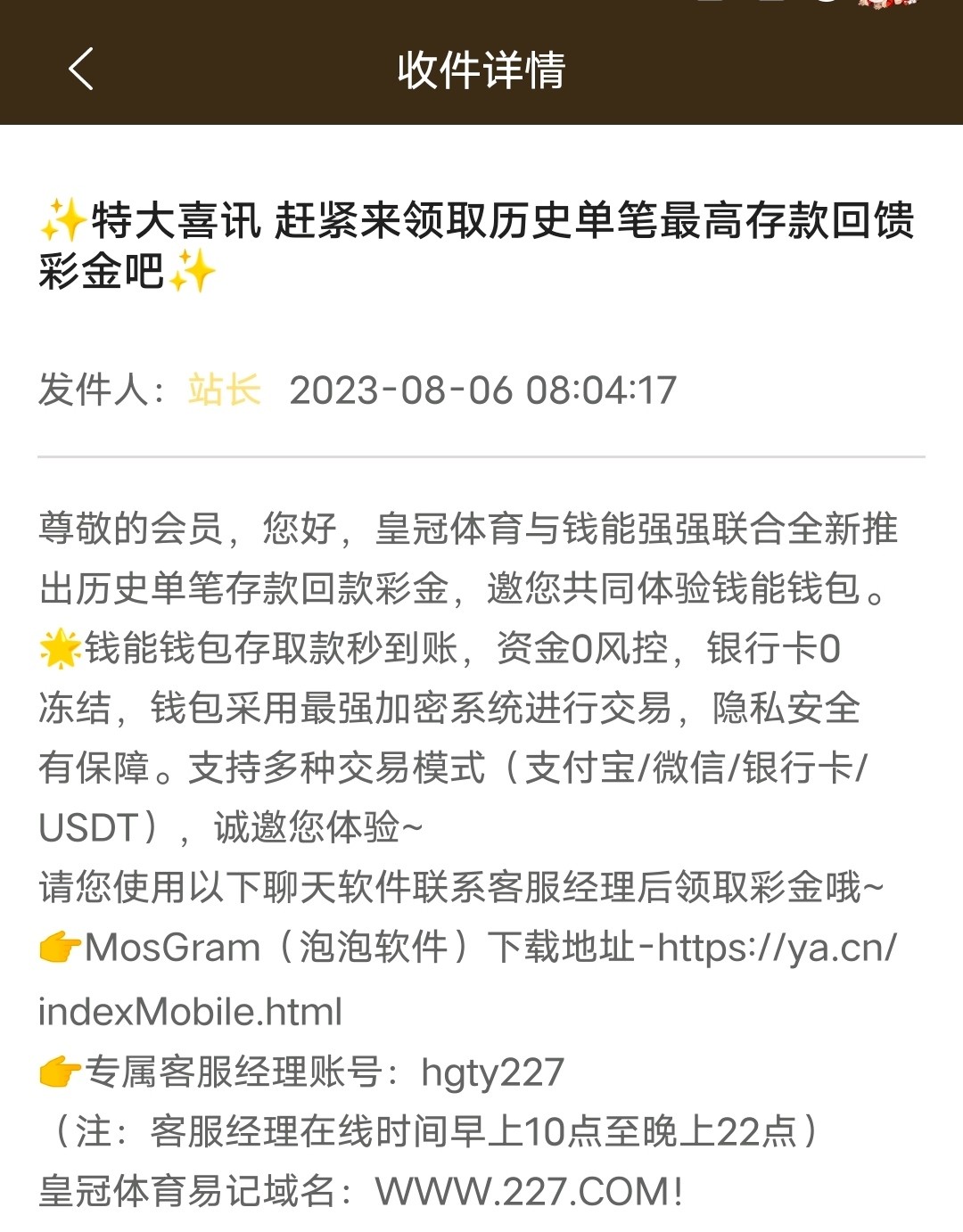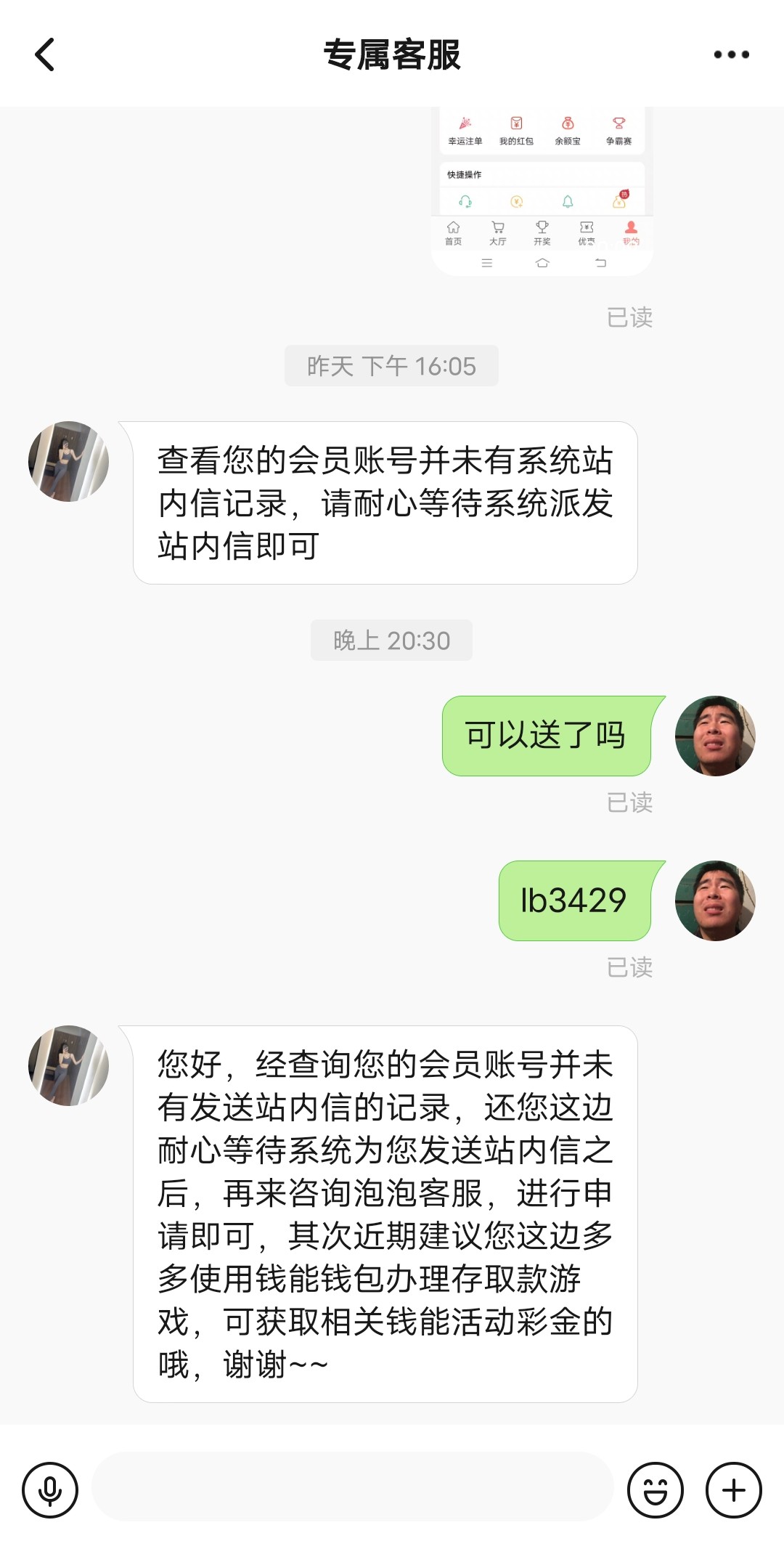 玩彩的站内信谁到了?麻烦发一下,死逼客服不给我专员联系方式,忽悠失败