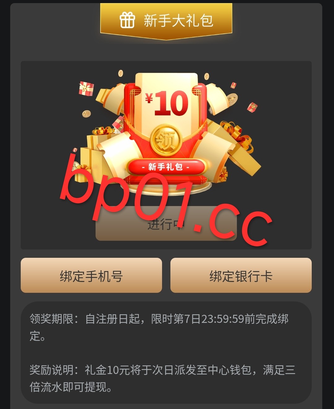 新用户注册绑卡绑定手机号 优惠里面自助领取10元彩金第二天送到钱包里面 无游戏限制3倍流水 最低提款100元 最高提款188元