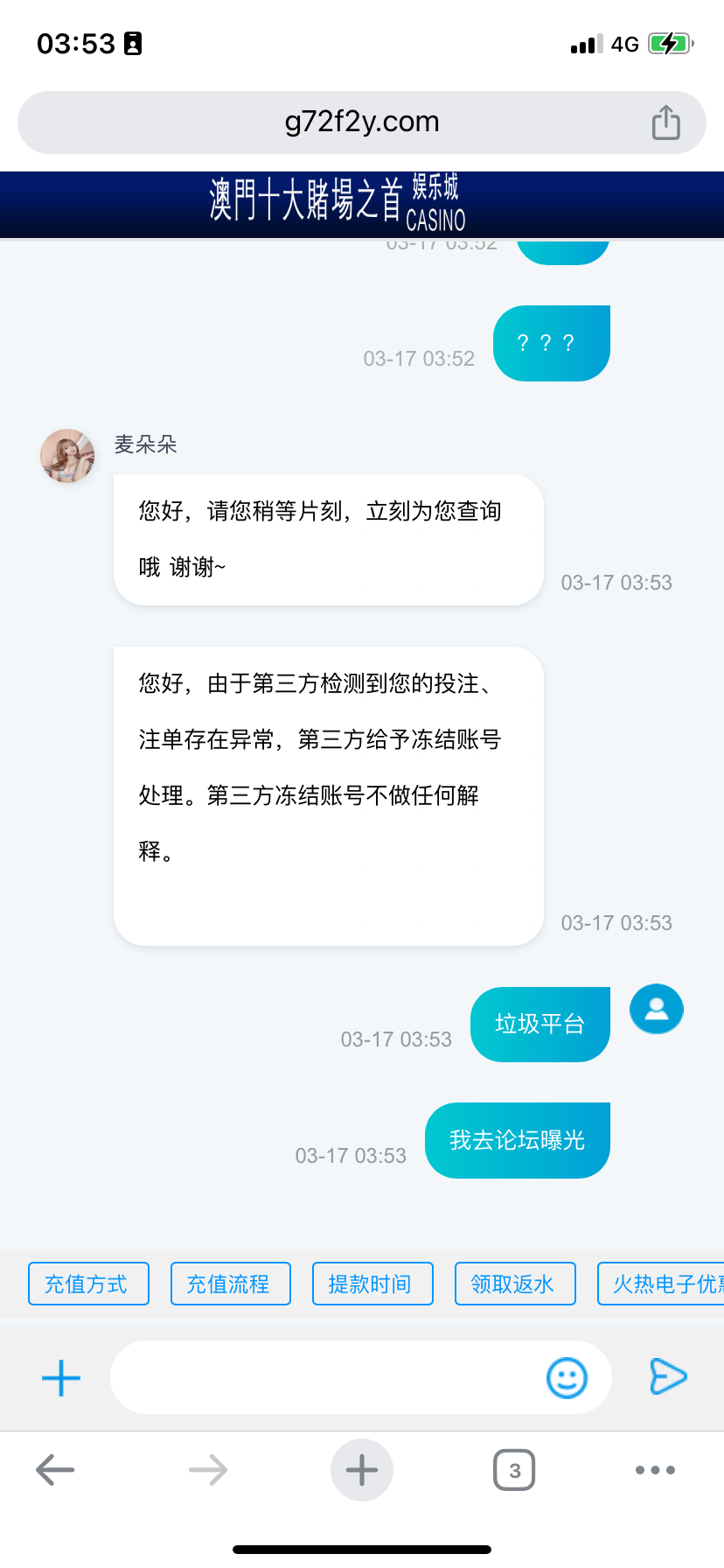 还有一个太阳城也是同一个后台控制的垃圾平台,狗庄的专员还说冻结的好,