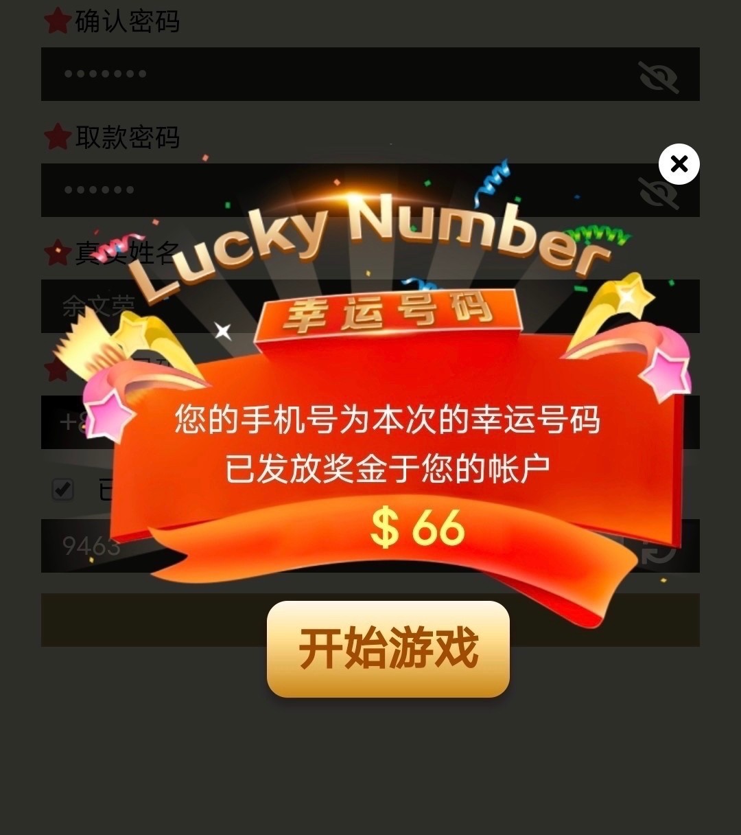 注册幸运号码直接弹框66元,跟之前另外一个老哥发的金沙赌场一个系列的。有弹框就有,没有勿喷