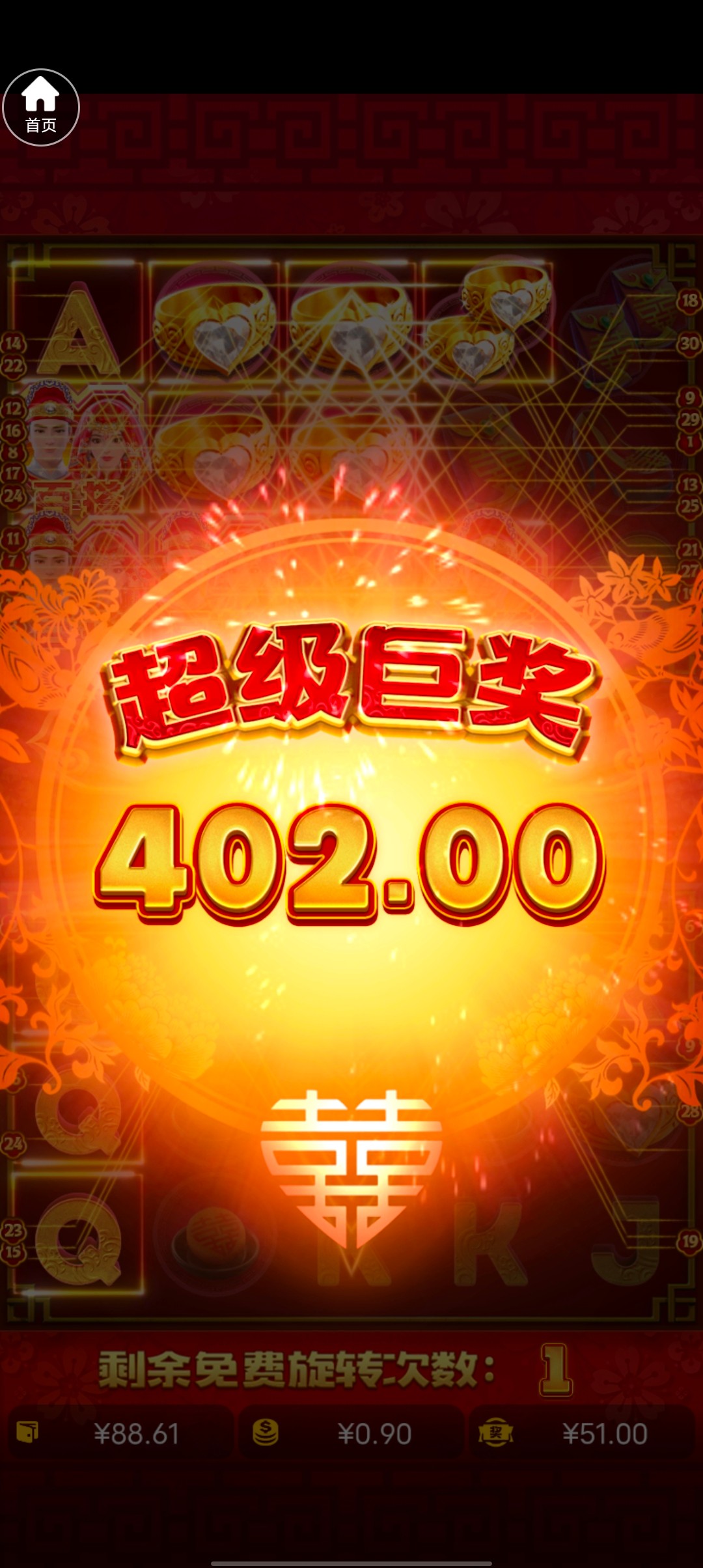 本来玩别的电子一直杀 输到30就想着来双喜试试,结果转了四五次来了免费给了500倍,然后去金鸡拉了十下进免费又来了五百倍,本来想着提个450送几十块钱,结果金鸡又炸了