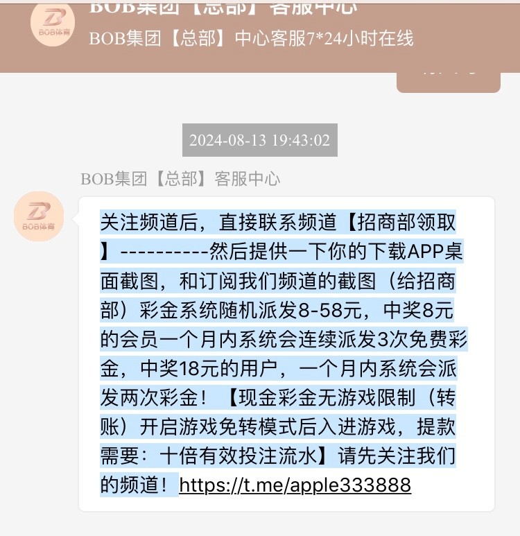关注频道后,直接联系频道【招商部领取】----------然后提供一下你的下载APP桌面截图,和订阅我们频道的截图(给招商部)彩金系统随机派发8-58元,中奖8元的会员一个月内系统会连续派发3次免费彩金,中奖18元的用户,一个月内系统会派发两次彩金!【现金彩金无游戏限制(转账)开启游戏免转模式后入进游戏,提款需要:十倍有效投注流水】请先关注我们的频道!