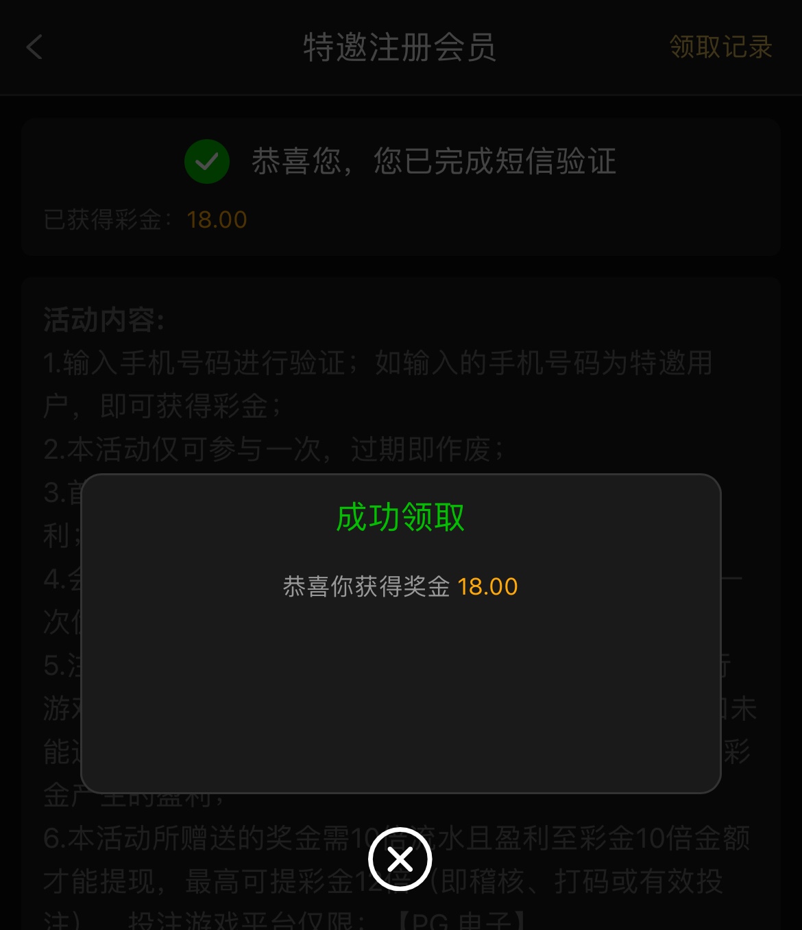 短信特邀碰瓷18彩金,注册绑定收款方式在优惠里自助领取,10倍流水,盈利彩金10倍金额才能提现,最高只能提彩金的12倍金额,就算不是特邀注册也送8彩金