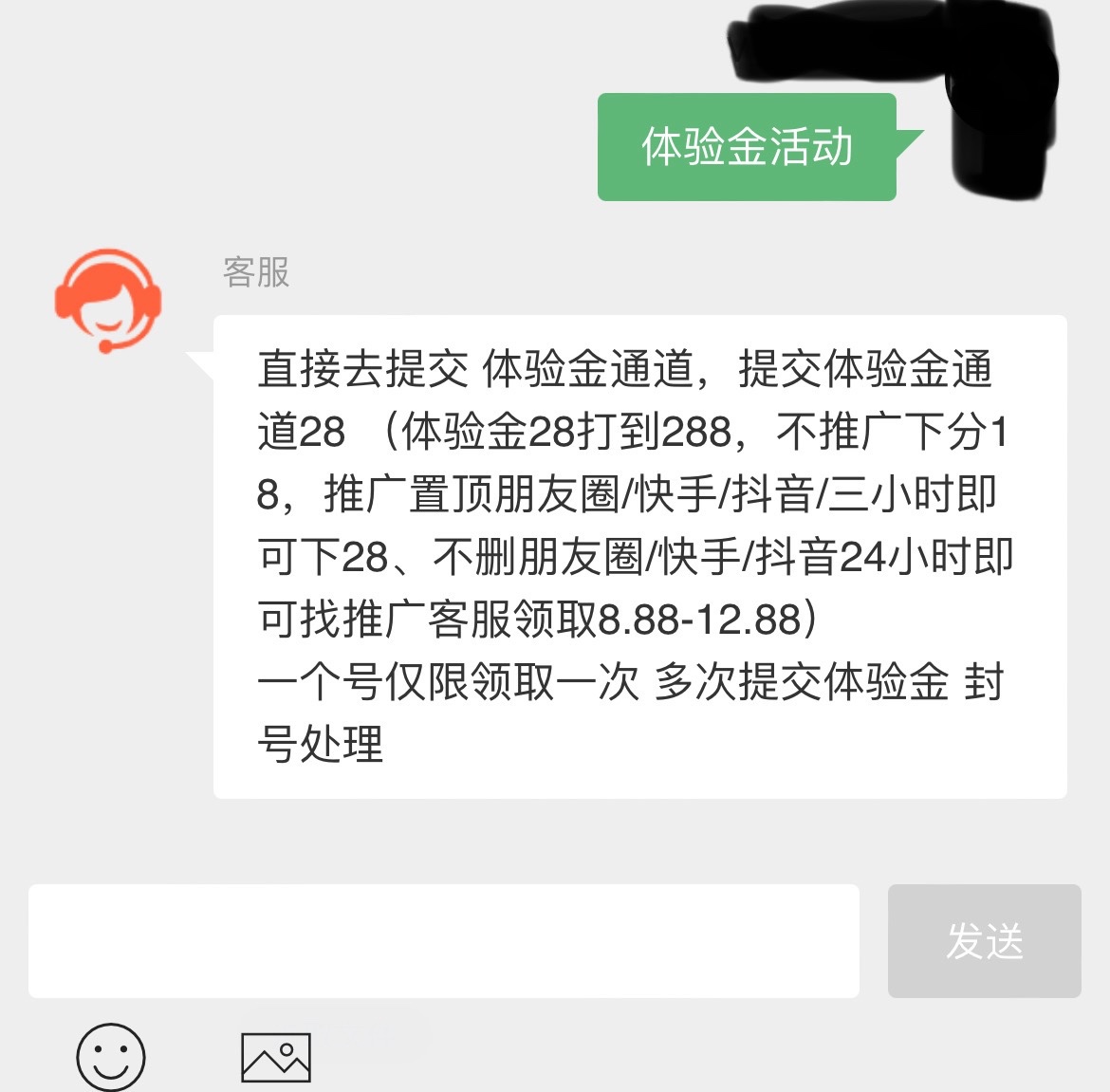 微信扫码登陆进去,充值那里有过体验金通道在那里直接28提交,打到288联系下18现金