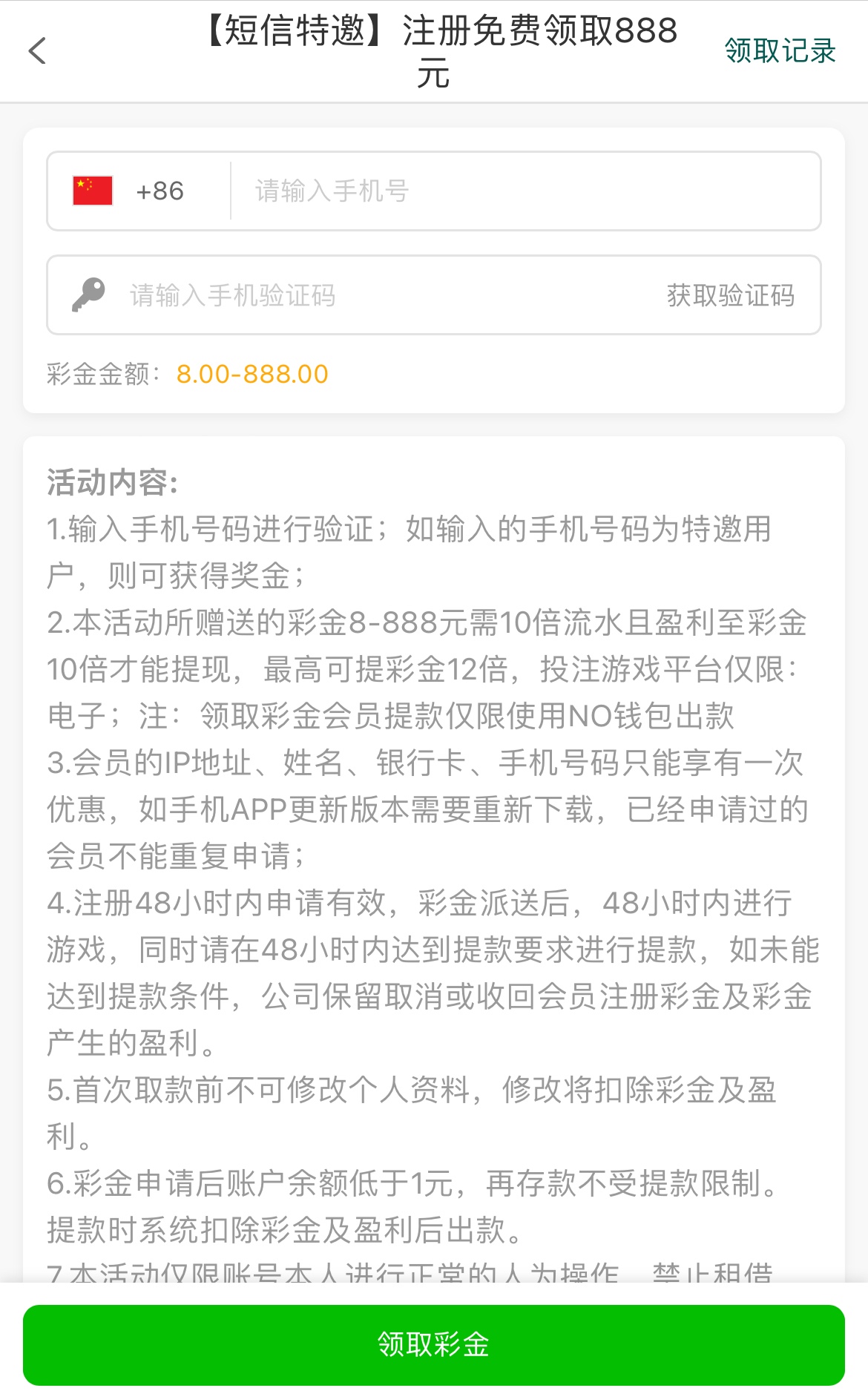 特邀碰瓷,注册绑定手机号/银行卡/个人信息,优惠自助领取,10倍流水且盈利至彩金10倍才能提现,最高可提彩金12倍,只能用NO全部取款