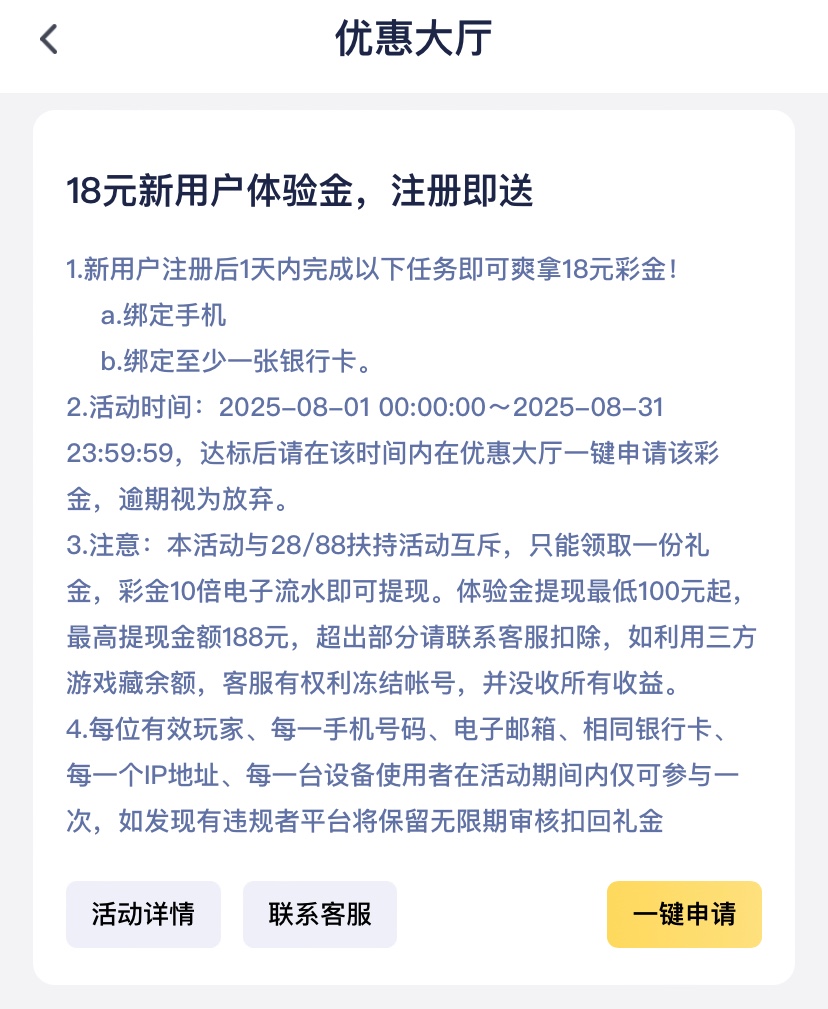 注册绑定手机号银行卡优惠里申请彩金最低100最高188提款,10倍流水仅限电子