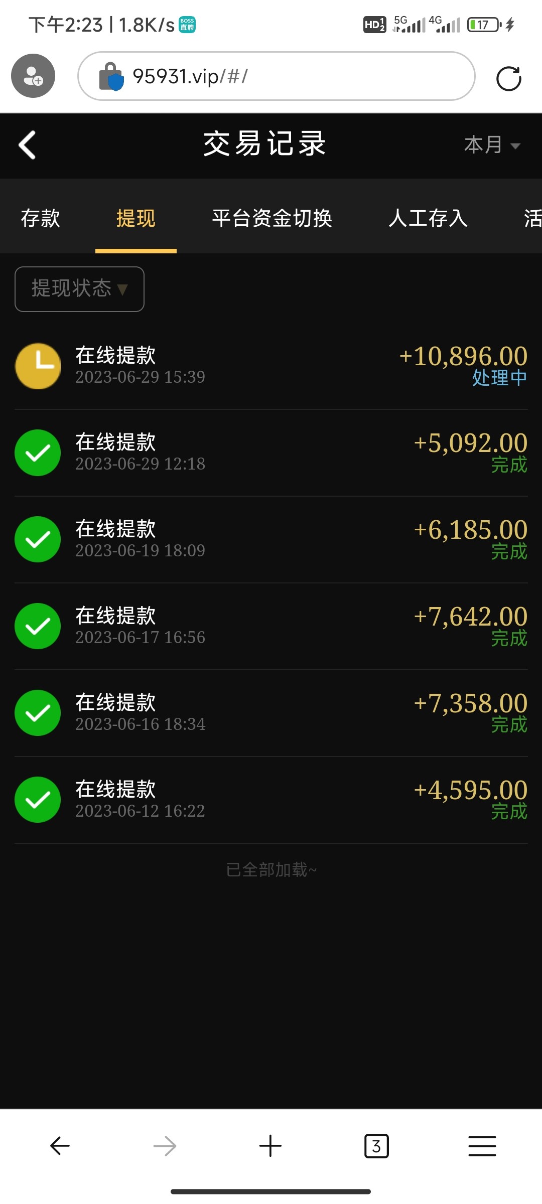 你这个前面给你提这么多 估计财务已经被电的不省人事了 后面换人了 你还敢提1w以上 不黑也得黑你了 现在台子 正规的 大额也都会黑了 因为日子不好过 除非是超级大客户 已经输了几百个的 大额给你 一般客户 绝逼黑你 包括玩了很久的 因为一般玩家几百个顶不过一个超级玩家 狗庄甚至懒得维护一般小玩家